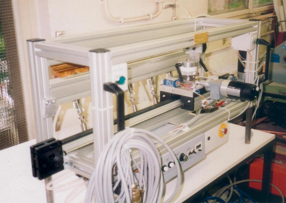 Alu-Rahmen L: 2050 mm, B: 450 mm, H:640 mm Kupferschienen und Schweißbacken, Spannhub: 5 mm Anpresskraft: 20000 N bei einem Luftdruck von 5 bar Schweißhub = X-Achse 1800 mm mit voreinstellbarer Geschwindigkeit: 0,2 - 1,2 m/min Eilgang 2,4 m/min, beim Zurückfahren Y-Achse von Hand zustellbar einschl. 2 Schweißschlitten Schweißpistolen auf dem Y-Schlitten voreinstellbar geklemmt